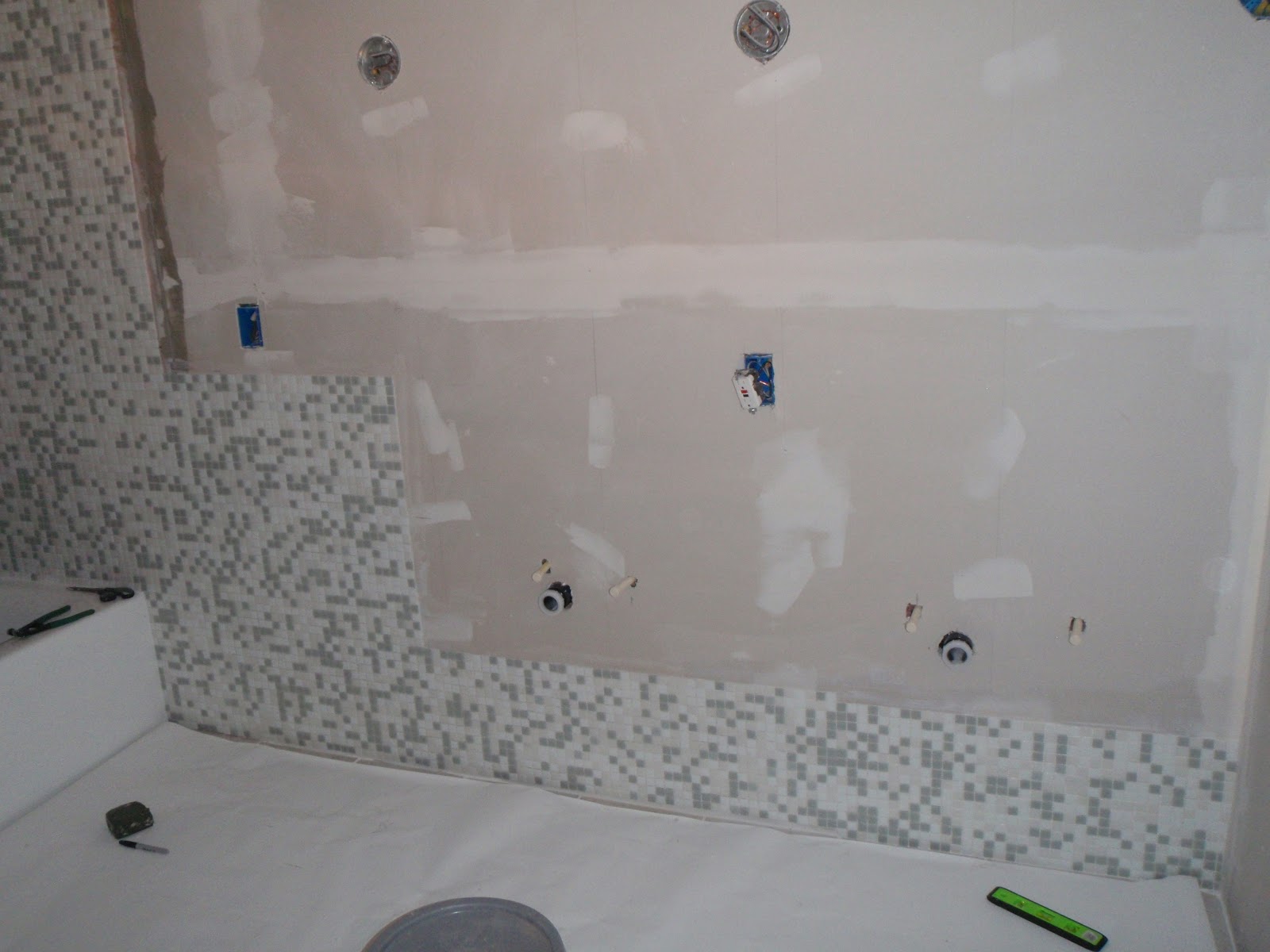 Here is the after shot of what I accomplished. It doesn't look like much, but it took me a half hour to get the mastic on just right, buttering the edges of the backer board next to the tub and the previous installed tile and cutting the tile to fit at the tub edge, before I could install the first partial sheet of tile.