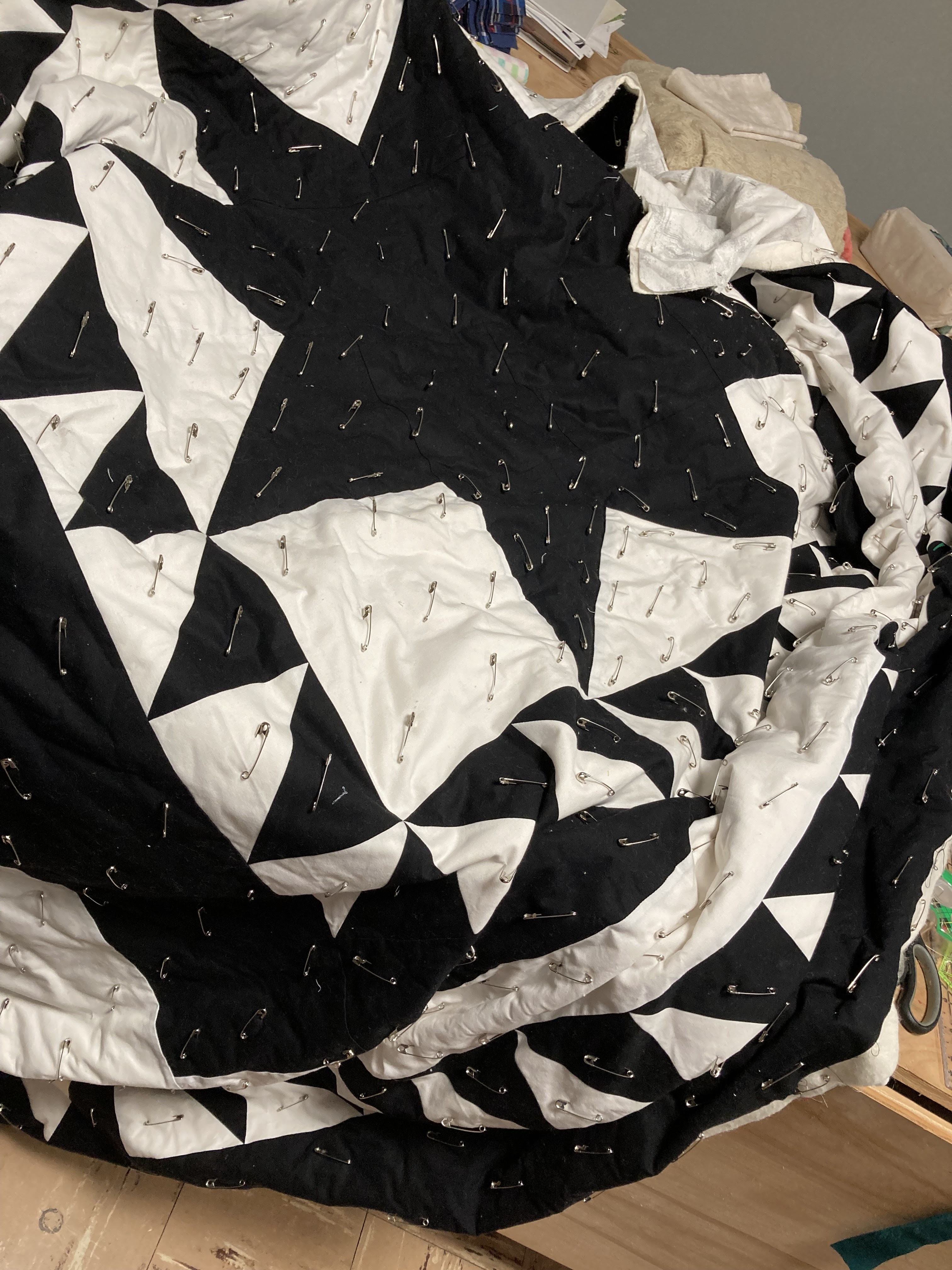2. The black and white quilt. I got started quilting this in 2021, but others more important items came up so it got set aside again, but at least it moved from just a top to being pin basted.