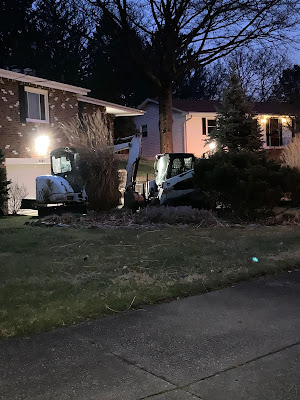 I saw that there was a small skid steer and small backhoe in the neighbor's driveway. They have a brick retaining wall that is in bad condition and a brick abutment that comes off the side of the garage; those are both coming down. The neighbors have had to wait to do this work until they had the money and have been wanting to do it for a long time. The abutment goes to the property line and Dave has to go thru my yard to get to the back of his property to mow. It's no big deal to me, but with the useless abutment gone he will glad to have easier access. I will take more pictures.